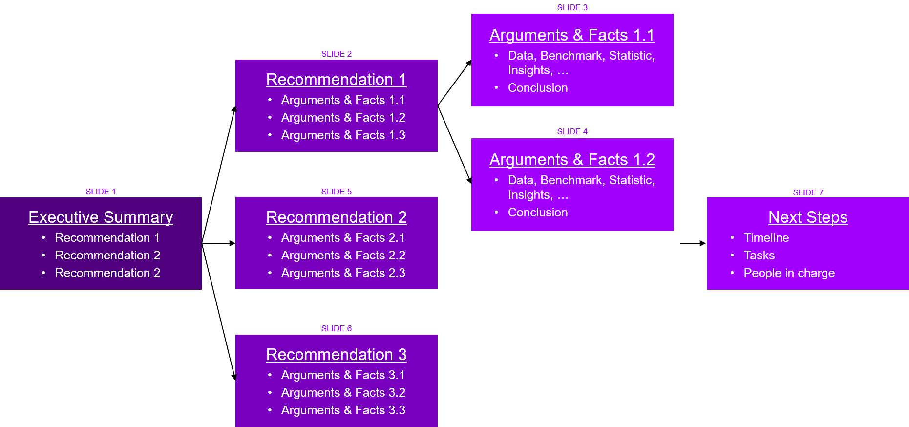 We present on the first slide the full solution, a summary for executives on one slide. The summary is structured in three to five recommendations. The recommendations are not overlapping, they are Mutually Exclusive and Collectively Exhaustive (MECE). This section is followed by one slide for each recommendation. On this slide we present the argument for each recommendation (data, facts, benchmarks, learnings, conclusions, ...).